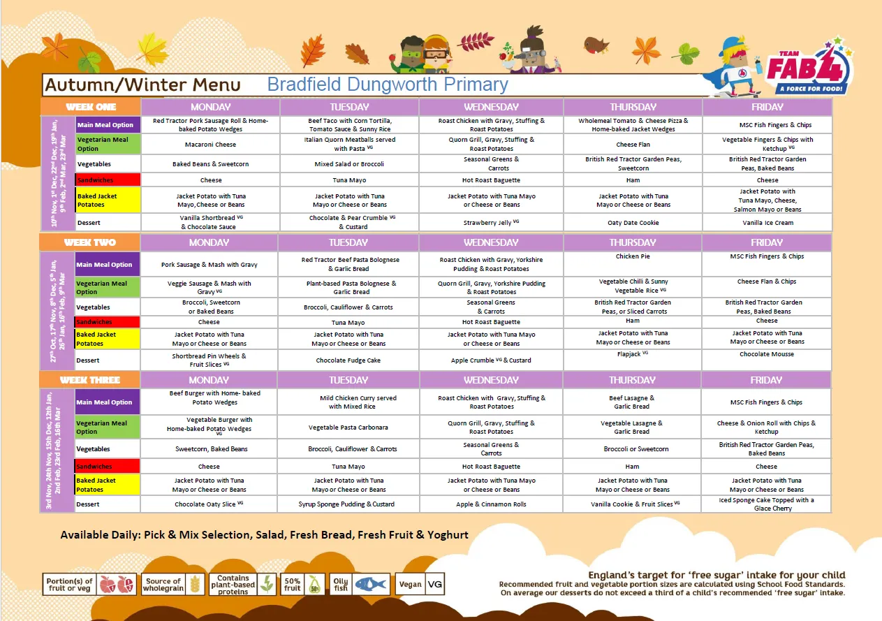 Our lunch time menu is provided by Taylor Shaw Caterers and is prepared and cooked fresh in our school kitchen each day. Our menus operate on a three week rota. We encourage our parents and carers to talk to their child each morning about their choice of school dinner. Children choose either a red, purple, yellow or green meal when the teacher takes the morning register.